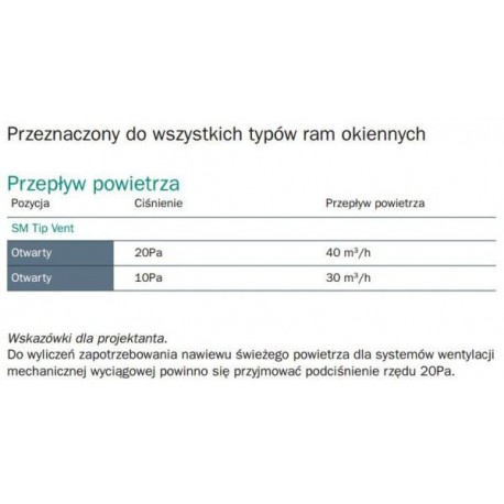 Nawiewnik okienny TipVent wykonany jest z wysokiej jakości ABS-u. Przeznaczony do montażu w oknach PVC, drewnianych i aluminiowych. Wyjątkowo łatwy montaż nawiewnika zapewniają zatrzaski, które pozwalają zainstalować nawiewnik bez używania wkrętów. Nawiewnik okienny TipVent ma możliwość ręcznego zamknięcia i otwarcia dwóch przepustnic co pozwala na precyzyjne kontrolowanie napływu świeżego powietrza z zewnątrz. Smukła budowa nawiewnika czyni go mało widocznym po zamontowaniu.