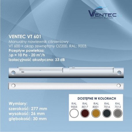 Manualny nawiewnik ciśnieniowy VT 601, jest urządzeniem, które w sposób kontrolowany zapewnia prawidłowy dopływ powietrza do pomieszczeń. Zgodnie z oceną wg PN-83/B-03430/Az3 nawiewnik VT 601 ma zastosowanie w wentylacji mechanicznej, grawitacyjnej i hybrydowej, jako elementem systemu wentylacji okiennej. Nawiewnik sterowany jest manualnie i nie wymaga jakiegokolwiek zasilania.