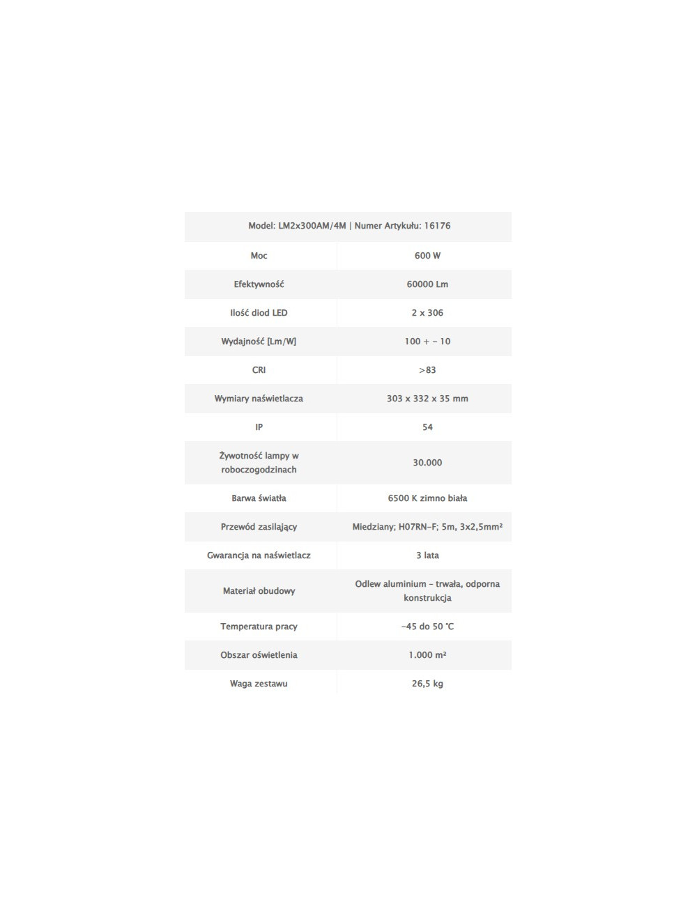 Model LM2x300AM/4M zapewnia mocne, stabilne światło, które znacząco poprawia komfort i bezpieczeństwo pracy. Dzięki możliwości ustawienia lamp w różnych kierunkach, można precyzyjnie dopasować oświetlenie do potrzeb.