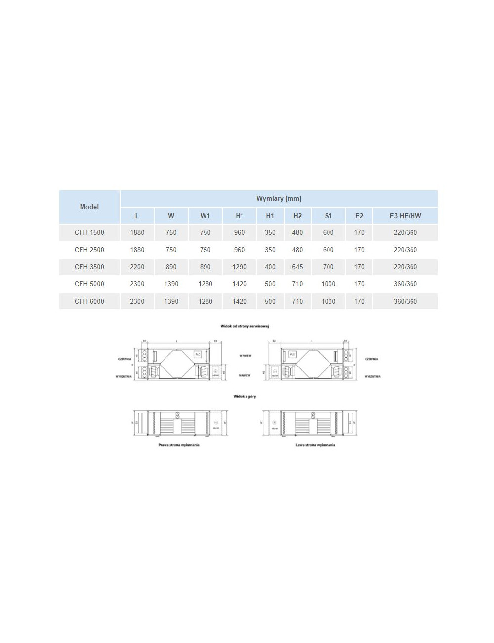 Centrale CFH HE są wyposażone w nagrzewnicę elektryczną do dodatkowego podgrzewania nawiewanego powietrza za rekuperatorem. Nagrzewnica montowana na kanale za centralą. Centrale CFH HW są wyposażone w nagrzewnicę wodną do dodatkowego podgrzewania nawiewanego powietrza za rekuperatorem. Nagrzewnica montowana na kanale za centralą. Centrale CFH nie mają wbudowanej nagrzewnicy elektrycznej, ale w razie potrzeby istnieje możliwość nabycia nagrzewnicy osobno.