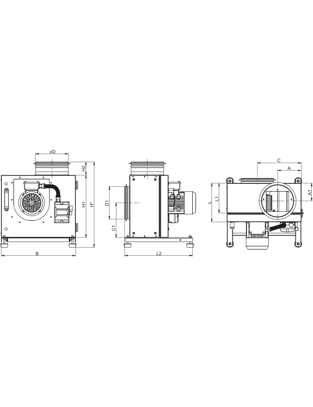 Wentylator promieniowy przeznaczony do montażu w instalacjach wyciągowych kuchni przemysłowych, z silnikiem umieszczonym poza przepływem powietrza.