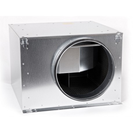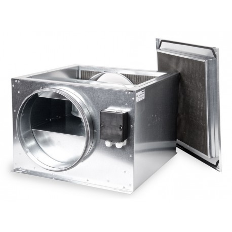 Promieniowy wentylator kanałowy. Prostokątna obudowa izolowana akustycznie wykonana z galwanizowanej blachy stalowej, z odchylaną pokrywą serwisową. Łatwo demontowalny moduł silnika i wirnika.